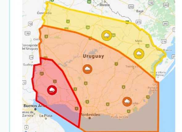 INUMET actualizó próximo a las 19hs un nivel de alerta roja para Fray Bentos y Nuevo Berlín por tormentas fuertes. El resto del departamento está bajo riesgo naranja