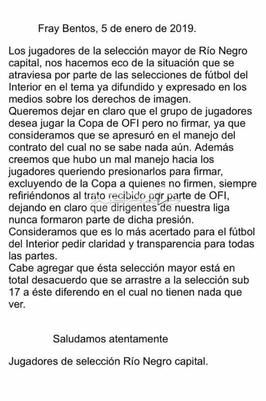 La selección de Fray Bentos expresó que desean jugar el torneo de OFI pero no firmar, "ya que consideramos que se apresuró en el manejo del contrato del cual no se sabe nada aún".