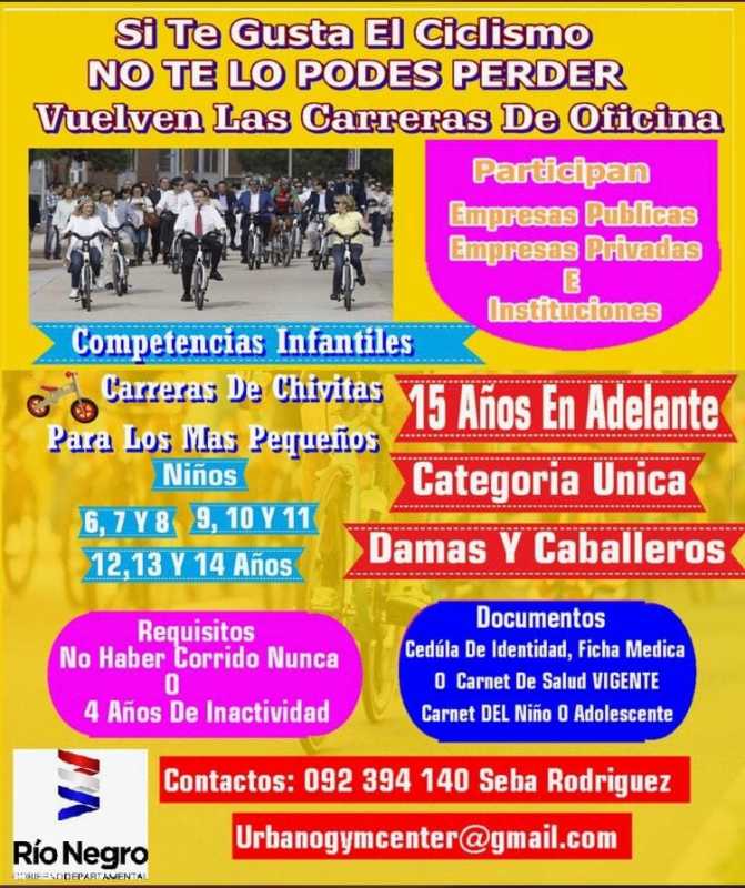 Este domingo, vuelven las clásicas Carreras de Oficina en ciclismo. Los participantes representan a Empresas Públicas, Privadas e instituciones. Habrá competencias infantiles (Chivitas), y hasta los 14 años. Luego largarán las Damas y posteriormente los Caballeros, ambos en categoría única por ahora.