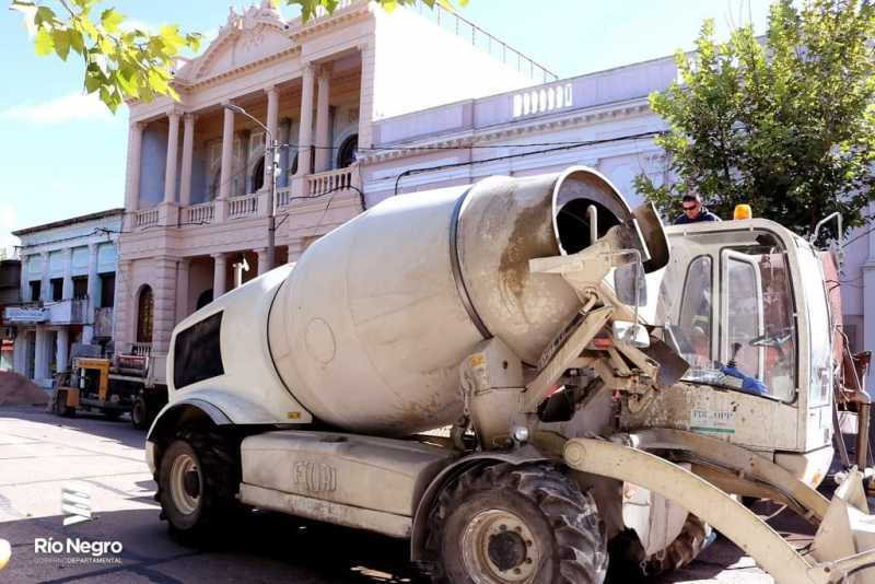 “El importante movimiento de obra en el día de hoy, que comenzó temprano en la mañana interviene un área de 91 m2, donde arriba del encofrado se procede al vertido del hormigón y a un posterior trabajo con “helicóptero” (para homogeneizar y distribuir convenientemente el material en la amplia superficie). Este proceso resultará en la obtención de un pavimento de hormigón visto, con resolución liso y de piedra partida en algunos sectores que será luego equipado con bancos y plantas (tipo mobiliario urbano)” expresó el Arq. Carlos Sobrino mientras los funcionarios llevaban adelante el trabajo “que comenzó hoy y termina hoy”, y para lo cual se utilizan máquinas mayores a lo habitual y una bomba que dosifica y suministra la mezcla. Luego de 3 a 4 días ayudado por un acelerante se podrá transitar el piso, que permitirá continuar “limpiando” la obra.