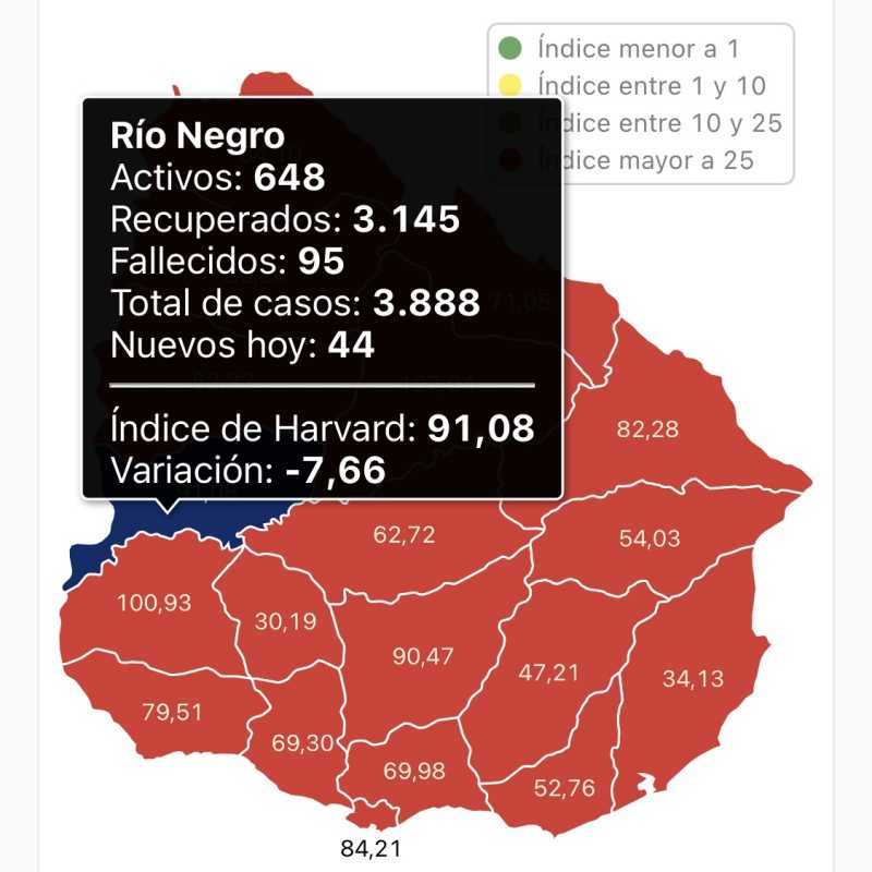 De los 2.702 casos nuevos, 1.216 son de Montevideo, 353 de Canelones, 131 de Tacuarembó, 120 de Colonia, 115 de Soriano, 104 de Salto, 103 de Maldonado, 86 de Artigas, 84 de San José, 81 de Paysandú, 71 de Rivera, 44 de Río Negro, 43 de Cerro Largo, 43 de Durazno, 30 de Florida, 24 de Treinta y Tres, 22 de Rocha, 21 de Lavalleja y 11 de Flores.