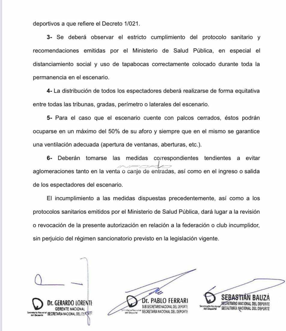 La Secretaría Nacional de Deporte y el Minsiterio de Salud Pública, realizan el siguiente comunicado, que entre otras cosas estira el aforo al 50 % para espectáculos al aire.