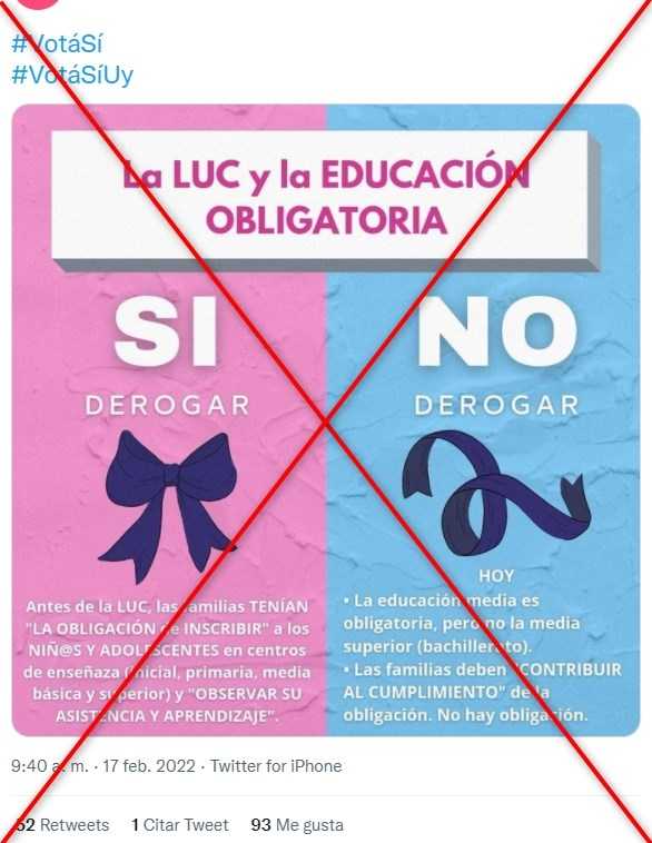 Algunas publicaciones comparten una imagen que asegura: “Antes de la LUC, las familias TENÍAN la ‘OBLIGACIÓN de INSCRIBIR’ a los NIÑ@S y ADOLESCENTES en centros de enseñanza. (...) HOY La educación media es obligatoria, pero no la media superior (bachillerato)”.