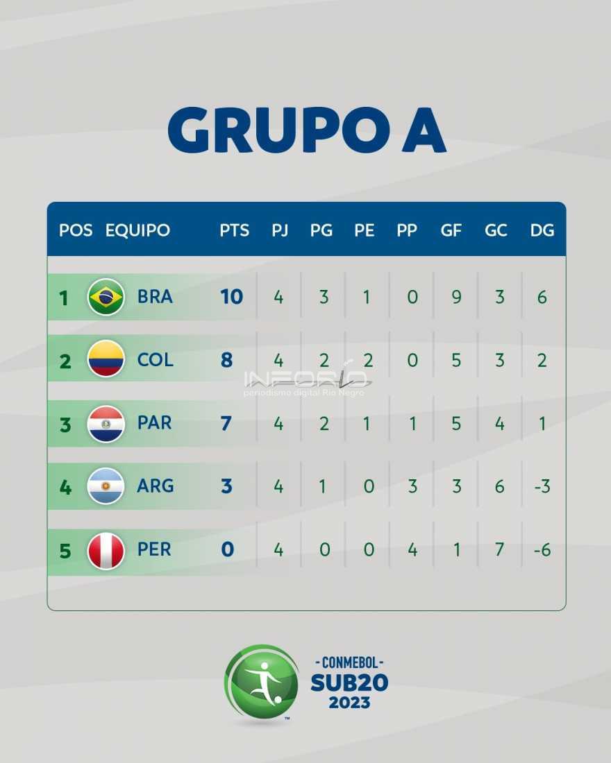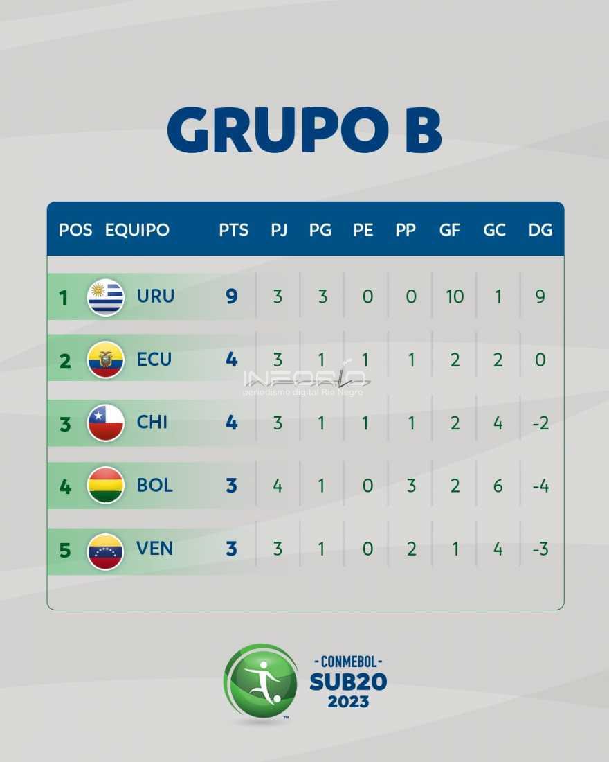 Estos son los partidos del sábado en la CONMEBOL Sub 20 que se disputa en Colombia. Hoy cierra el Grupo B, donde el único clasificado anticipado es Uruguay. La Tabla en éste Grupo indica que: 1º-Uruguay 9 Pts (Clasificado), 2º-Ecuador 4 Pts (+0), 3º-Chile 4 Pts. (-2), 4º-Bolivia 3 Pts. (-3 eliminado pues queda libre en la última fecha) y 5º-Venezuela 3 Pts. (-3).- En el otro Grupo anoche, Colombia le ganó 1-0 a Argentina y no solo clasificó sino que dejó afuera los argentinos. Tabla Grupo A: 1º-Brasil 10 Pts, 2º-Colombia 8 Pts. 3º-Paraguay 7 Pts, 4º-Argentina 3 Pts (eliminado) y 5º-Perú 0 Pts. (eliminado).