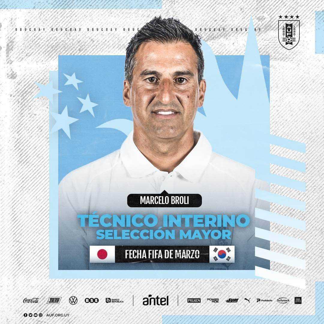 Al no confirmarse todavía, si continuará Diego Alonso al frente a la selección uruguaya Mayor o habrá nuevo Entrenador, la AUF designó para ésta doble fecha FIFA de Marzo, al DT de la selección Vice Campeona Sudamericana Sub 20, Marcelo Broli. Éste en el día de ayer, dio a conocer la lista de Reservados, que viajarán a territorio Asiático, para enfrentar a Japón y a Corea. Hay muchas sorpresas, las primeras que ninguno de los “5 Históricos” (que jugaron su último Mundial) no están (Llámese Suárez, Cavani, Godín, Cáceres ni Muslera) y que designó a muchos jóvenes, marcando el “recambio” que todos esperábamos. Los arqueros son: Sergio Rochet, Santiago Mele, Gastón Olveira y Guillermo de Amores. Sebastián Coates, Martín Cáceres, Agustín Rogel, Santiago Bueno, Federico Pereira, Ronald Araújo, Guillermo Varela, José Luis Rodríguez, Gio González, Mathías Olivera, Viña y Joaquín Piqueréz, son los defensas reservados. Los mediocampistas son Lucas Torreira, Manuel Ugarte, Matías Vecino, Federico Valverde, Nicolás De la Cruz, Giorgian De Arrascaeta my Felipe Carballo. Los delanteros son Facundo Pellistri, Agustín Canobbio, Brian Rodríguez, Diego Rossi, Brian Ocampo, Facundo Torres, Darwin Núñez, Maxi Gómez, Jonathan Rodríguez Thiago Borbas y Matías Arezo.