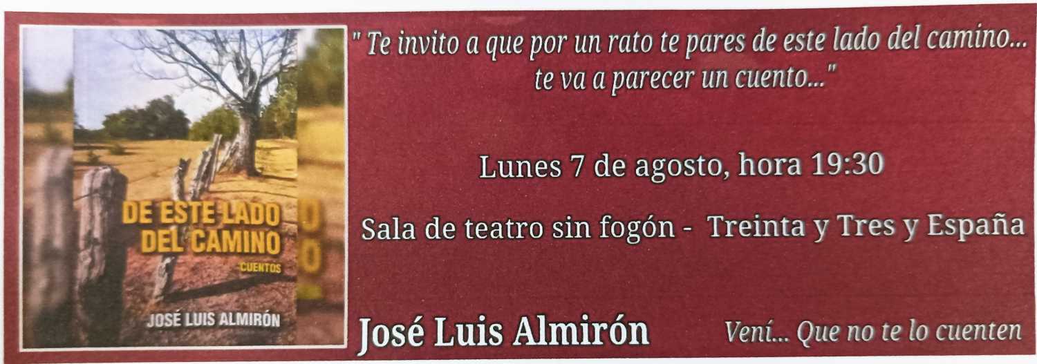 El lunes 7 de agosto, a la hora 19.30, en la sala del teatro Sin Fogón, ubicada en calles Treinta y Tres y España de la ciudad de Fray Bentos, se realizará la presentación de un nuevo libro del escritor fraybentino José Luis Almirón. Se trata de un libro de cuentos titulado: “De este lado del camino”. La invitación está hecha y dice: “Vení… que no te lo cuenten”.
