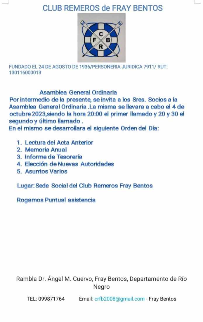 El Club Remeros Fray Bentos, por éste medio realiza el Llamado a Asamblea General Ordinaria, para éste Miércoles 4 de Octubre, en su sede social. La misma es a partir d ela hora 20:00 como primer llamado y a las 20:30 horas el Segundo y último llamado.