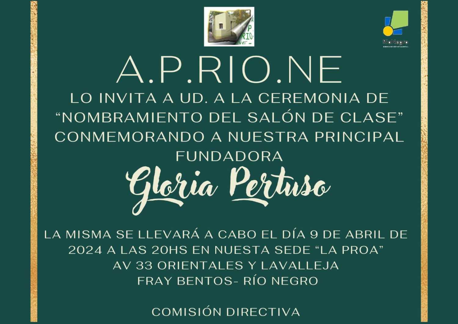 La Asociación de Plásticos de Río Negro está invitando a la población, a la ceremonia de nombramiento del salón de clase de su institución con el nombre de “Gloria Pertuso”.