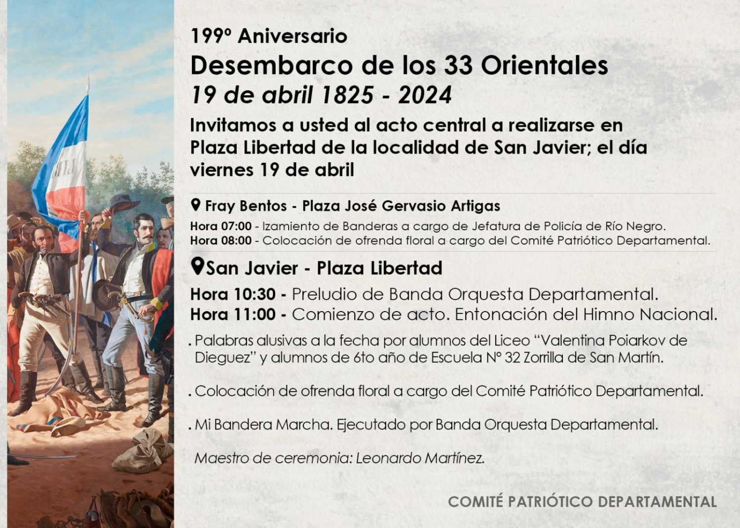 Los actos centrales de la celebración de los 199 años del Desembarco de los Treinta y Tres Orientales en la playa de La Agraciada se realizarán mañana viernes 19 en la plaza Libertad de la localidad de San Javier, iniciándose la concentración a la hora 10.30 para dar inicio al acto a la hora 11.00.