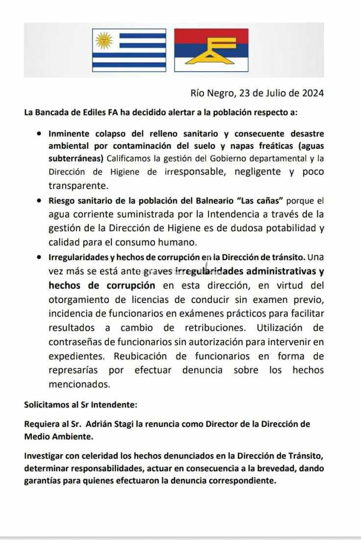 En virtud de la gravedad de los hechos, la edila del Frente Amplio, Karina Sánchez, manifestó que la fuerza de izquierda le pide al Intendente Lafluf que le solicite la renuncia al Director de Ambiente, Adrián Stagi, por no cumplir con los compromisos acordados.