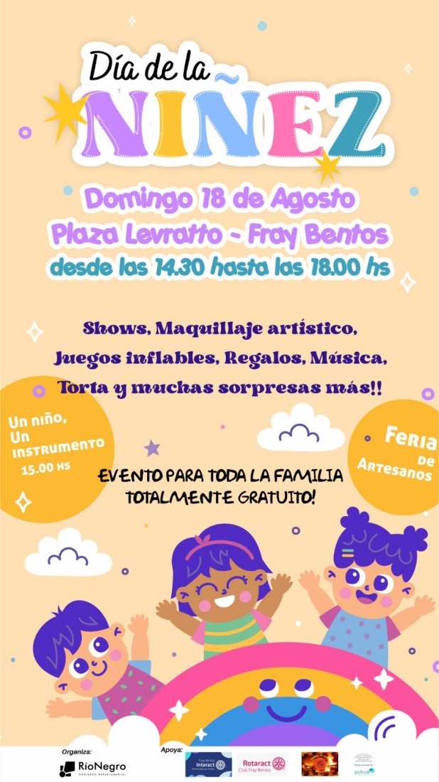 En Fray Bentos, el domingo 18 de agosto, de 14.30 a 18 horas, en la plaza Levratto, frente a la escuela N° 7, se realizarán actividades recreativas y artísticas con música, maquillaje y otras sorpresas. A la hora 15 se presentará el Programa “Un niño, un instrumento” y durante la jornada se instalará la Feria de los Artesanos.