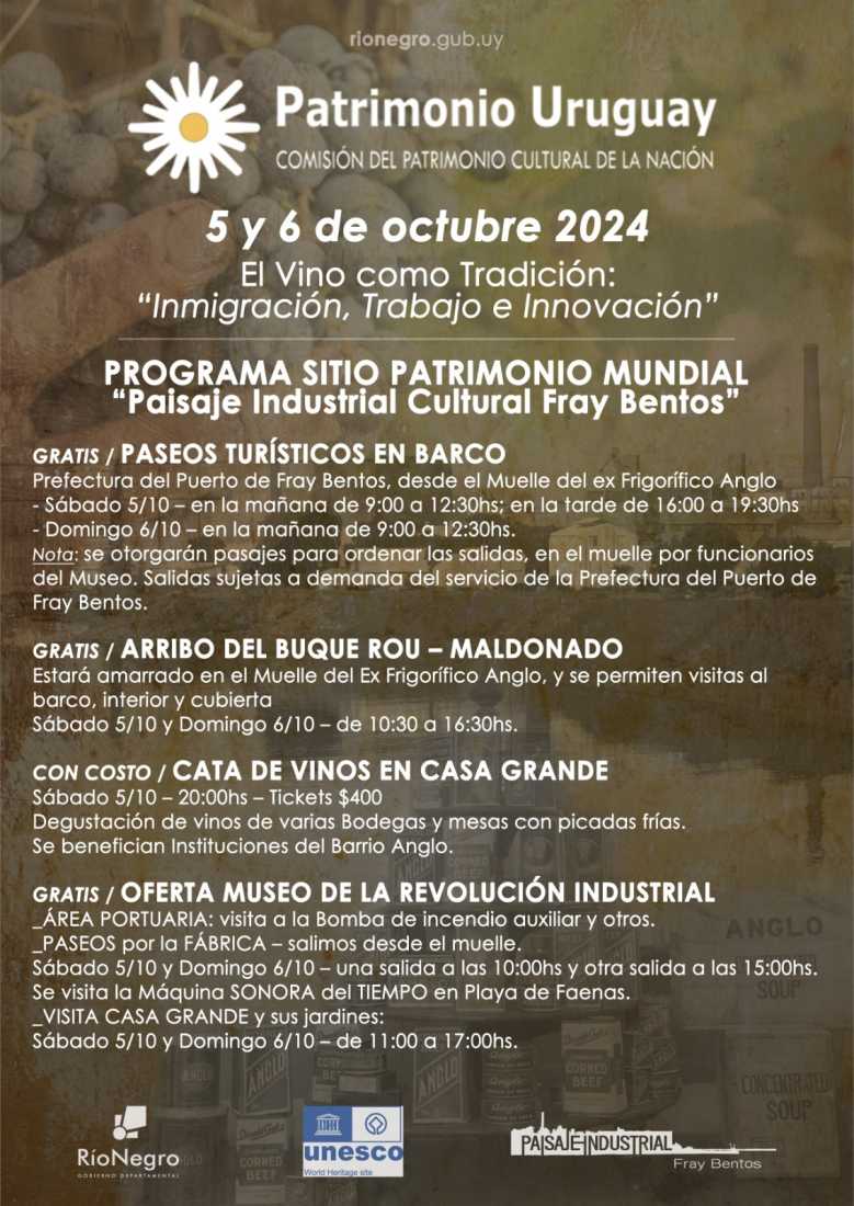 En Río Negro, las actividades se han centralizado en el Sitio Patrimonial Mundial “Paisaje Industrial Cultural Fray Bentos”, en el barrio Anglo, y allí se desarrollarán diversas propuestas como por ejemplo: paseos turísticos en barco, visita al interior del buque ROU Maldonado, cata de vinos en Casa Grande, paseos por diferentes espacios del Museo de la Revolución Industrial y del Anglo.