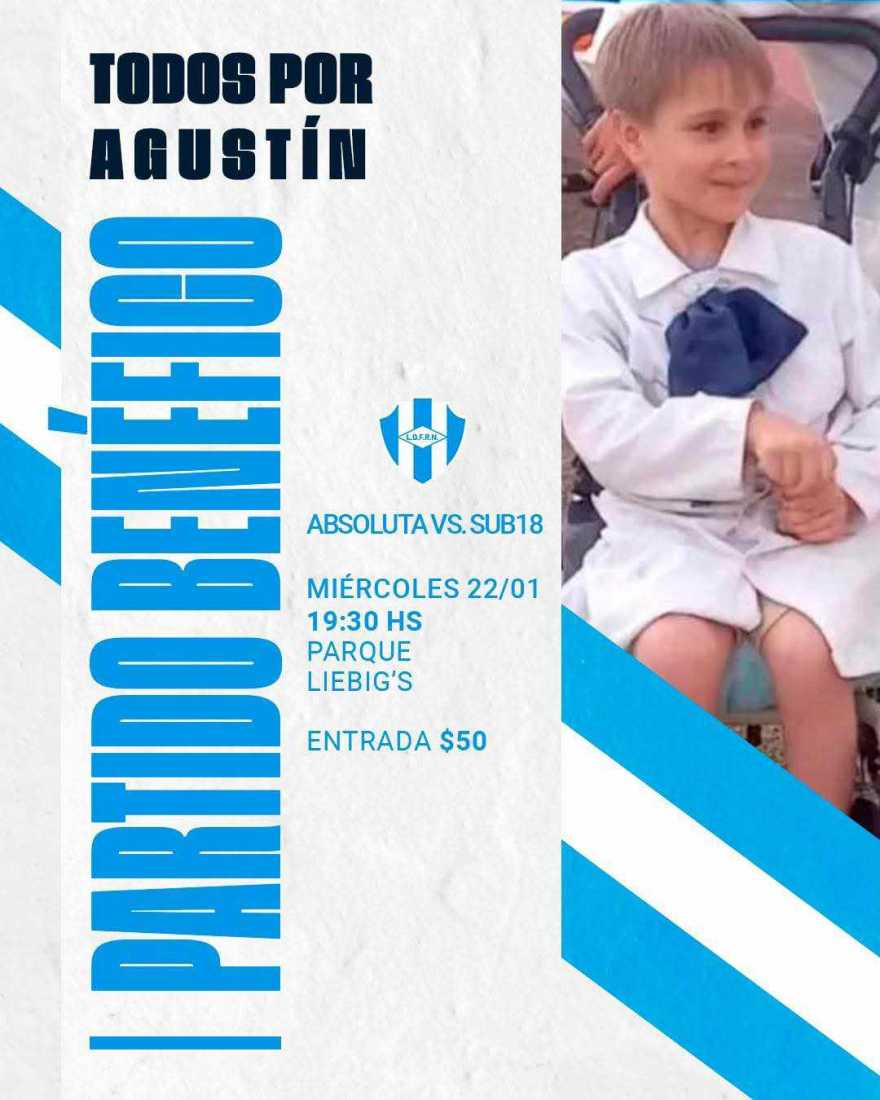 Hoy miércoles 22 de enero, la Liga Departamental de Futbol de Río Negro se solidariza con la situación del niño Agustín Modernell y realizará en el Parque Liebig’s; un partido entre las selecciones Absoluta y SUB-18, a beneficio de Agustín. Los esperamos a todos. Entrada: $50