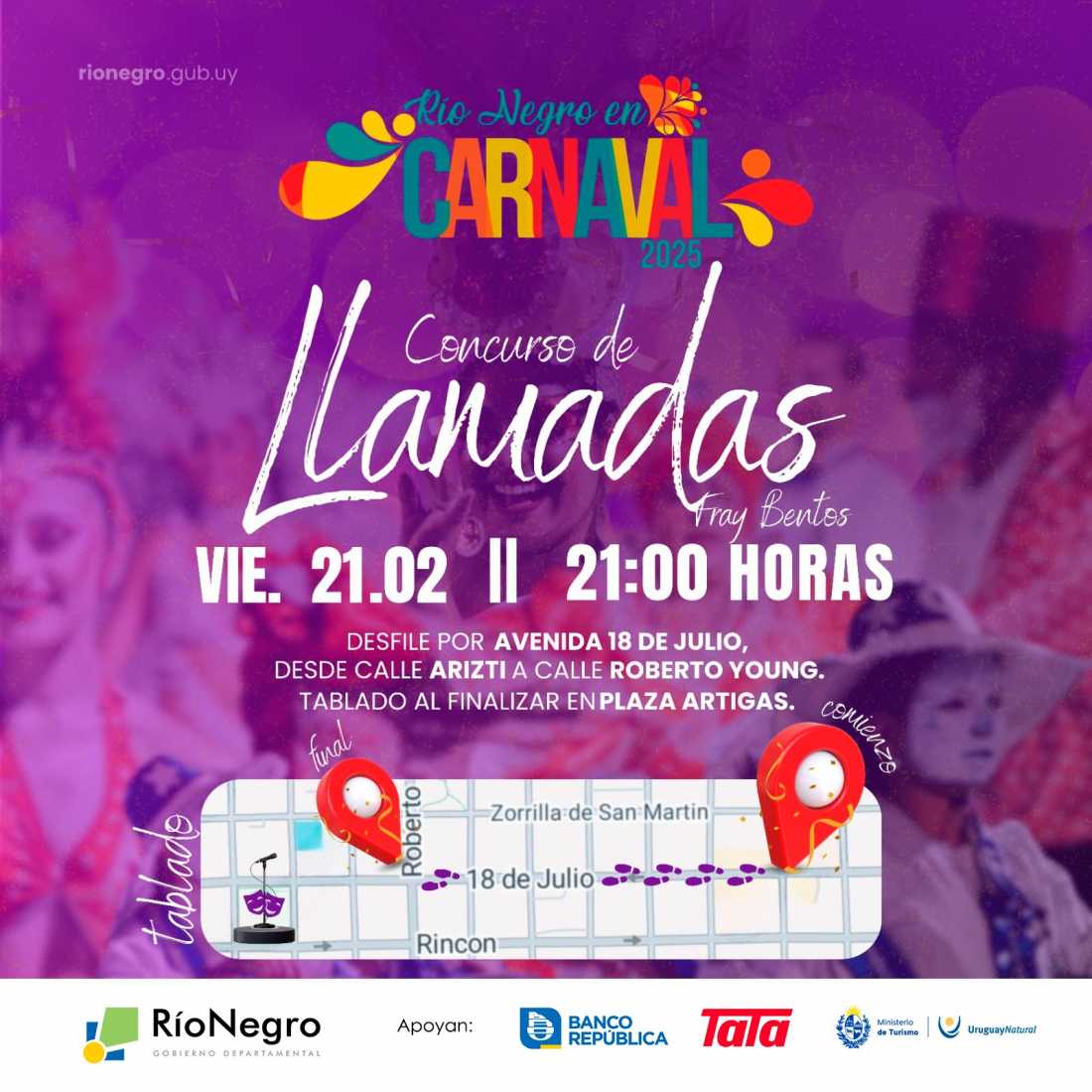 Hoy viernes 21 de febrero, desde la hora 21.00, en Fray Bentos, se realizará el Concurso de Llamadas, en el marco del carnaval 2025.