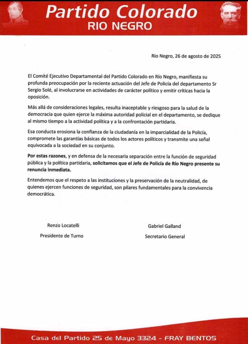 El Partido Colorado emitió un comunicado público donde también solicita la renuncia y/o destitución del actual Jefe de Policía Sergio solé, por su reciente participación en una reunión política partidaria y se suma, sus propias declaraciones pública a una emisora radial.