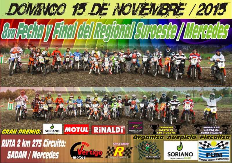 Se llega poco a poco, a la culminación de los distintos torneos del año, en especial lo que respecta a los de la Federación Uruguaya de Motociclismo. En ésta, muchos campeonatos finalizan este fin de semana y saldrán nuevos campones regionales, asi que las actividades para este semana se cuenta mas de 5 actividades en todo el país y una de los campeonatos que culmina es el del Regional Suroeste, que se define en la ciudad de Mercedes en en el Circuito SADAM del "Club el Remanso" un expectaculo que promete mucho los dias 14 y 15 de noviembre.