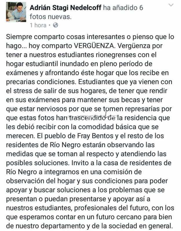 Siempre comparto cosas interesantes o pienso que lo hago... hoy comparto VERGÜENZA. Vergüenza por tener a nuestros estudiantes rionegrenses con el hogar estudiantil inundado en pleno período de exámenes y afrontando éste hogar que los recibe en precarias condiciones. Estudiantes que ya vienen con el stress de salir de sus hogares, de tener que rendir en sus exámenes para mantener sus becas y tener que estar nerviosos por que se tomen represarías por que estas fotos han trascendido de la residencia que les debió recibir con la comodidad básica que se merecen. El pueblo de Fray Bentos y el resto de los residentes de Río Negro estarán observando las medidas que se toman al respecto y atendiendo las posibles soluciones. Invito a la casa de residentes de Río Negro a integrarnos en una comisión de observación del hogar y sus condiciones para poder apoyar y buscar soluciones a los problemas que se presentan o puedan presentarse y apoyar así a nuestros estudiantes, profesionales del futuro, con los que esperamos contar en un futuro cercano para bien de nuestro departamento y de la sociedad en general.