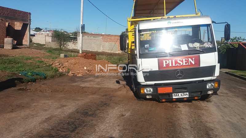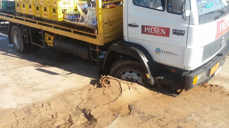 Un camión de reparto de Pilsen, circulaba por la calle que delimita el barrio Fray Bentos 2000 con el ex barrio Obrero, cuando de repente se hundió en el pavimento.