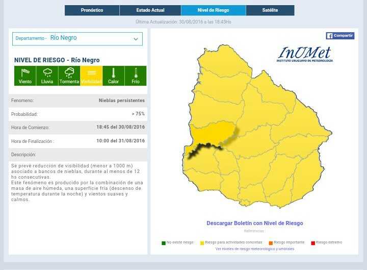 El INUMET ha emitido una advertencia de color amarillo para todo el país por niebla. El hecho ocurrió hoy en la zona sureste del país, pero ahora se extiende para todo el país.