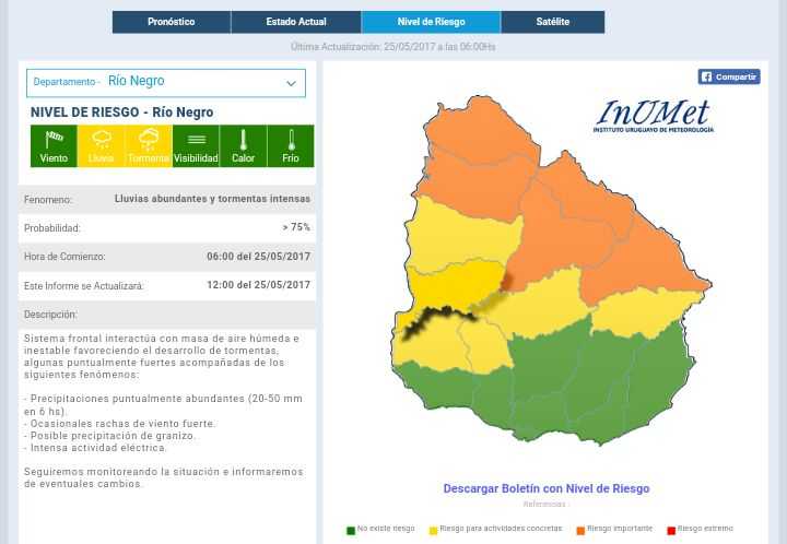 El INUMET emitió esta madrugada una actualización meteorológica de su boletín especial y extendió el nivel de advertencia a varios departamentos entre ellos Rio Negro y Soriano por lluvias y tormentas.