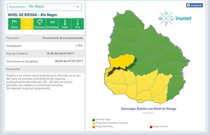 Si bien en principio la advertencia no incluía a Río Negro, sobre las 18:30hs se actualizó también para el departamento.
