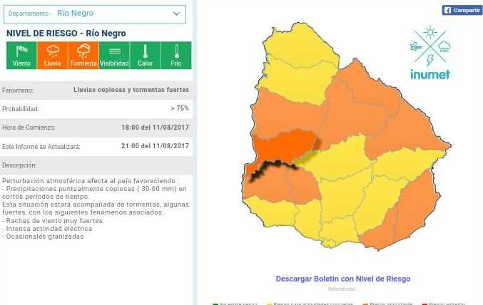 El INUMET publicó esta tarde una nueva actualización del boletín meteorológico y para Río Negro y Soriano el nivel de alerta ahora es naranja.