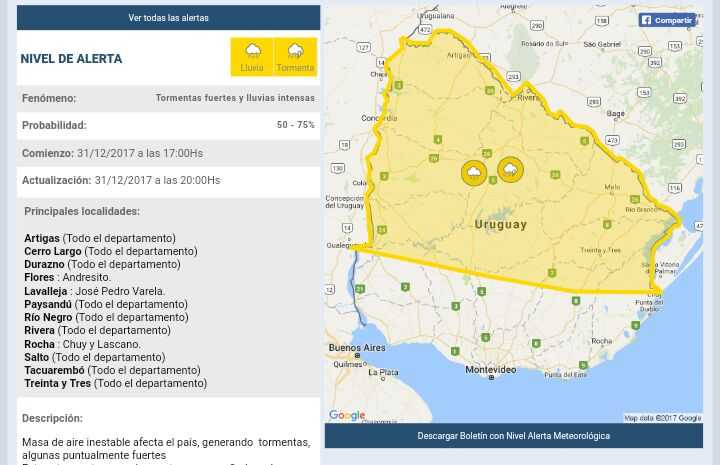 Masa de aire inestable afecta el país, generando tormentas, algunas puntualmente fuertes Estas tormentas pueden estar acompañadas de intensa actividad eléctrica, rachas de viento fuerte del sector sur, precipitaciones intensas en cortos periodos de tiempo, ocasional caída de granizo. Se continuará monitoreando la situación y se informará de eventuales cambios.