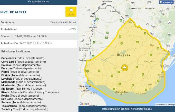 El INUMET ha emitido una advertencia meteorológicos para más de medio país por persistencia de lluvias.