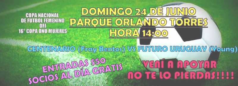 El Centenario FC por la 16ª Copa Nacional “Copa ONU Mujeres - Gol al Futuro”, declarado de Interés Deportivo por la Secretaría Nacional del Deporte, debuta el domingo, a partir de las 14:00 horas, en el Parque Orlando Torres, frente a Uruguay de Young. Entrada a $ 50.-