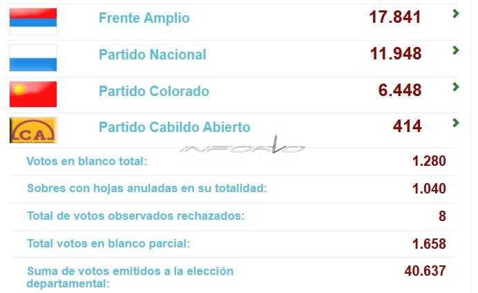 CONSIDERANDO A LOS PARTIDOS POLÍTICOS, EL RESULTADO FUE EL SIGUIENTE:El Frente Amplio obtuvo 17.841 votos, el 38%, siendo el Partido más votado.El Partido Nacional obtuvo 11.948 votos, el 26%.El Partido Colorado alcanzó los 6448 votos, el 16%.Cabildo Abierto logró 414 votos, el 1%.Además, lo...