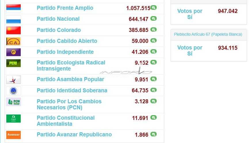 Los resultados de los escrutinios primarios de las comisiones receptoras de votos a nivel de todo el país, escrutados el 99,92%, indican que el Frente Amplio ha obtenido 1.057.515 votos, el 43,3%, siendo el Partido más votado nuevamente.El Partido Nacional obtuvo 644.147 votos, el 26,4%.El Partido Colorado alcanzó lo...