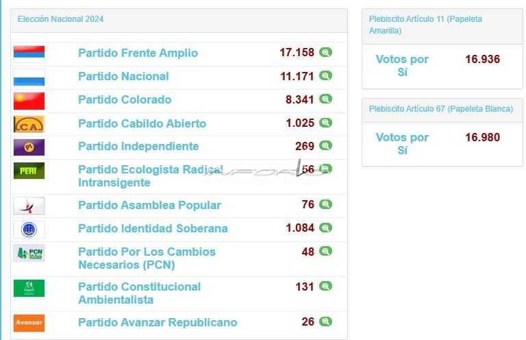 Frente Amplio - 17.346 votos.Partido Nacional -11.333Partido Colorado- 8.446Partido Identidad Soberana- 1.090Cabildo Abierto- 1.052Partido Independiente- 270Partido Ecologista Radical Intransigente- 56Partido Asamblea Popular- 77Partido Por Los Cambios...