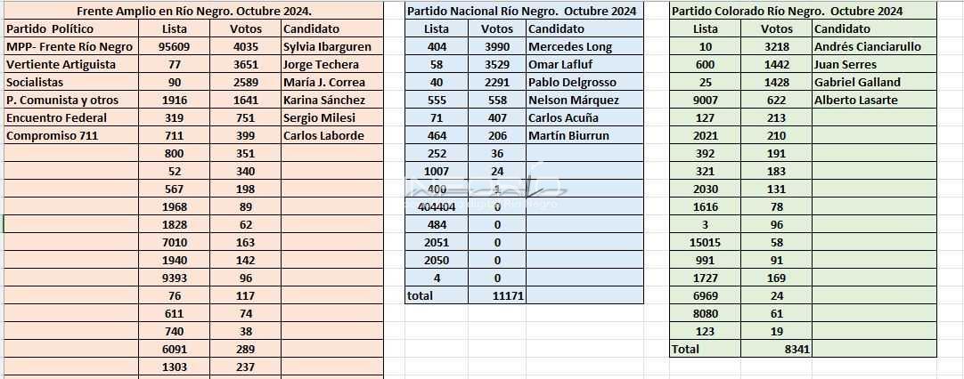 Los resultados de los escrutinios primarios de las comisiones receptoras de votos a nivel del departamento de Río Negro, escrutados el 100% de los circuitos, pero aún faltando 520 votos observados, indican lo siguiente:El Frente Amplio ha obtenido 17.158 votos, el 41%, siendo el Partido más votado.El Partido Nacional...