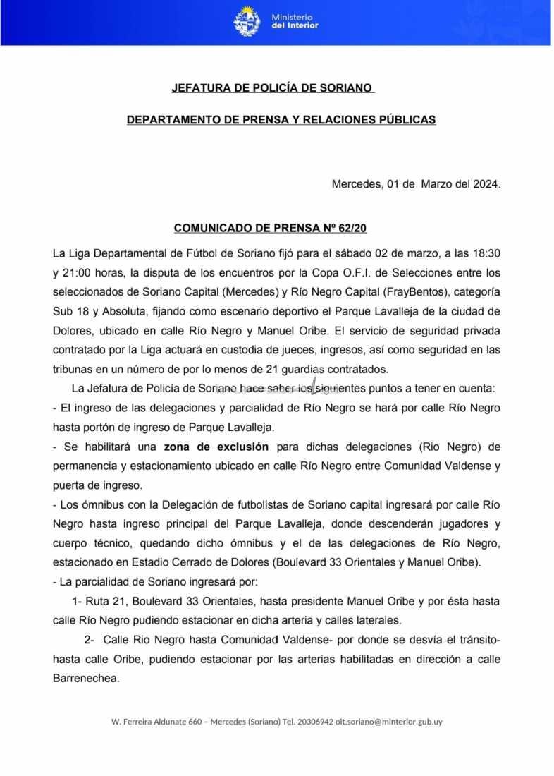 Referente a los encuentros de fútbol entre Soriano y Río Negro, a jugarse en Dolores por las finales del Litoral ....