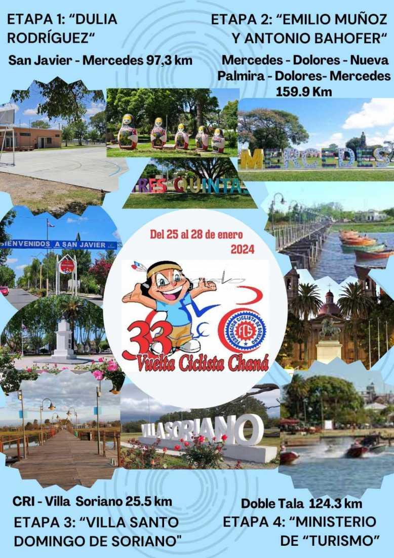 Una nueva edición de la clásica Vuelta Chaná se corre desde este jueves, integrando el departamento de Río Negro con el de Soriano.El jueves, con largada desde San Javier, se corre la 1° etapa, hasta el rosedal de Mercedes, en un total de 97.300 km.; que lleva como nombre a la destacada jueza fraybentina Dulia...