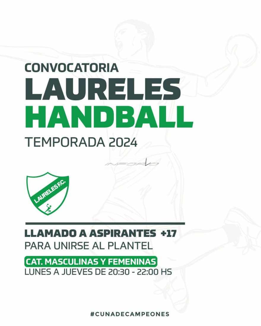 El grupo de Hanfball del Laureles FC, tiene un llamado abierto para mayores de 17 años (tanto en la rama Femenina y Masculina) para integrar el equipo, que se apronta para la presente temporada.Si querés integrarte a practicar este deporte, acercate al club Ranero de Lunes a Jueves de 20:30 a 22:00 horas.-...