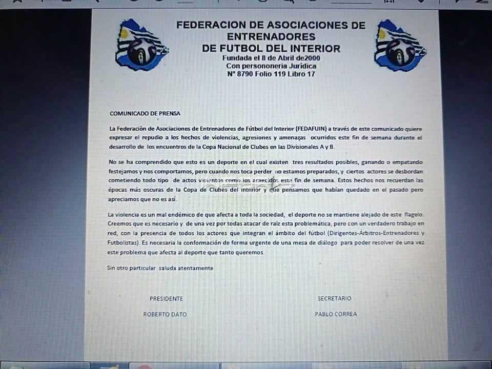La Federaciòn de Asociaciones de Entrenadores de Fútbol del Interior (FEDAFUIN) a través de este comunicado quiere expresar el repudio a los hechos de violencias, agresiones y amenazas ocurridos este fin de semana durante el desarrollo de los encuentros de la Copa Nacional de Clubes en las Divisionales A y B.