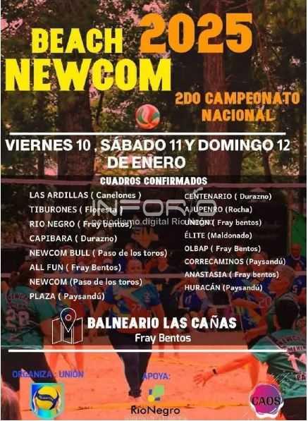 Este viernes 10, sábado 11 y domingo 12 de enero se realizará la segunda edición del Campeonato Nacional de Beach Newcom en el balneario Las Cañas, en Río Negro.Organiza el club Unión de newcom de Fray Bentos y están confirmados 16 equipos de diferentes localidades de nuestro país donde...
