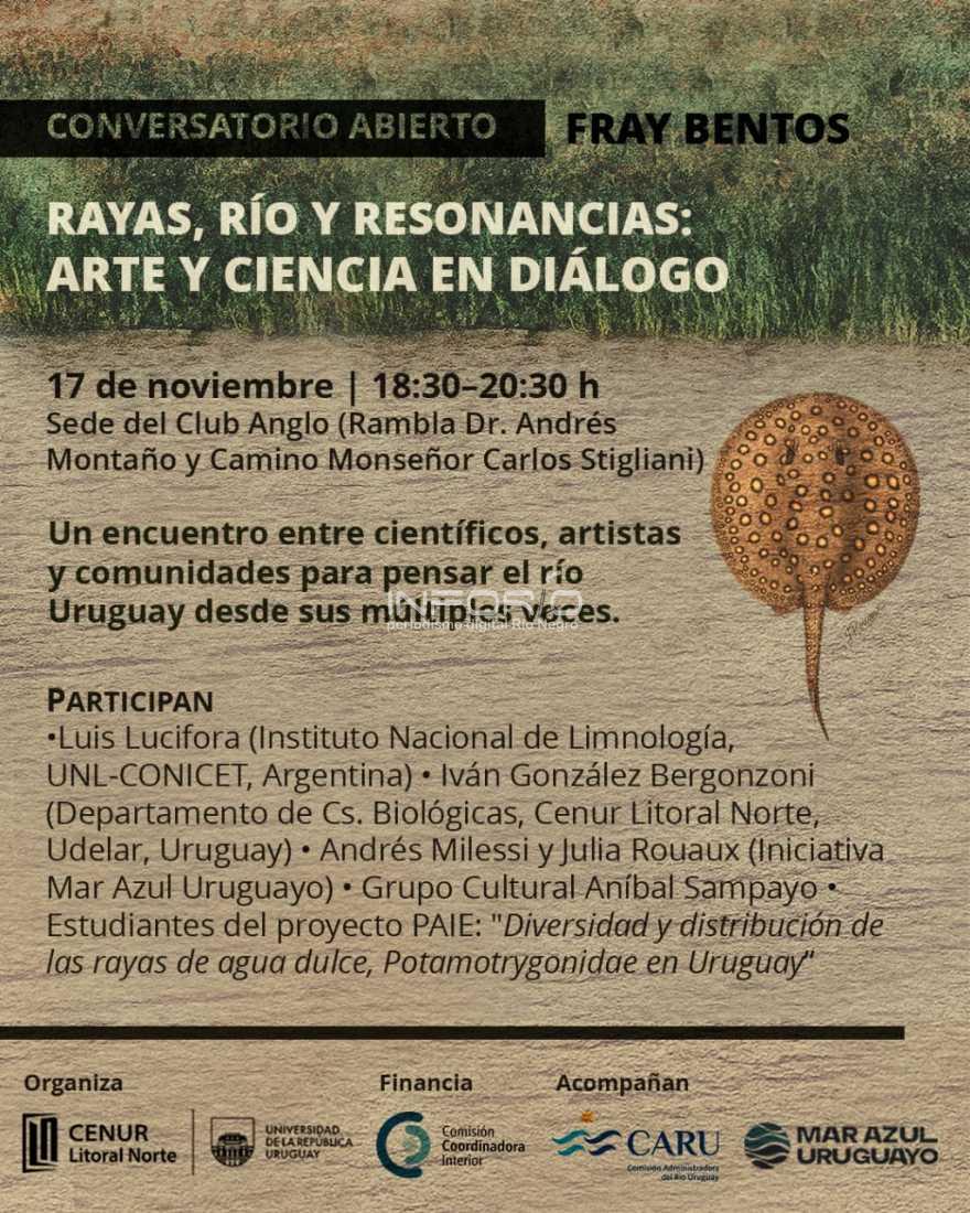 El lunes 17 de noviembre, de 18.30 h a 20.30 h, en la sede del Club Atlético Anglo de la ciudad de Fray Bentos, se desarrollará una instancia denominada: “Conversatorio abierto: rayas, río y resonancias: arte y ciencia en diálogo”.Se trata de un encuentro entre artistas y científicos con l...