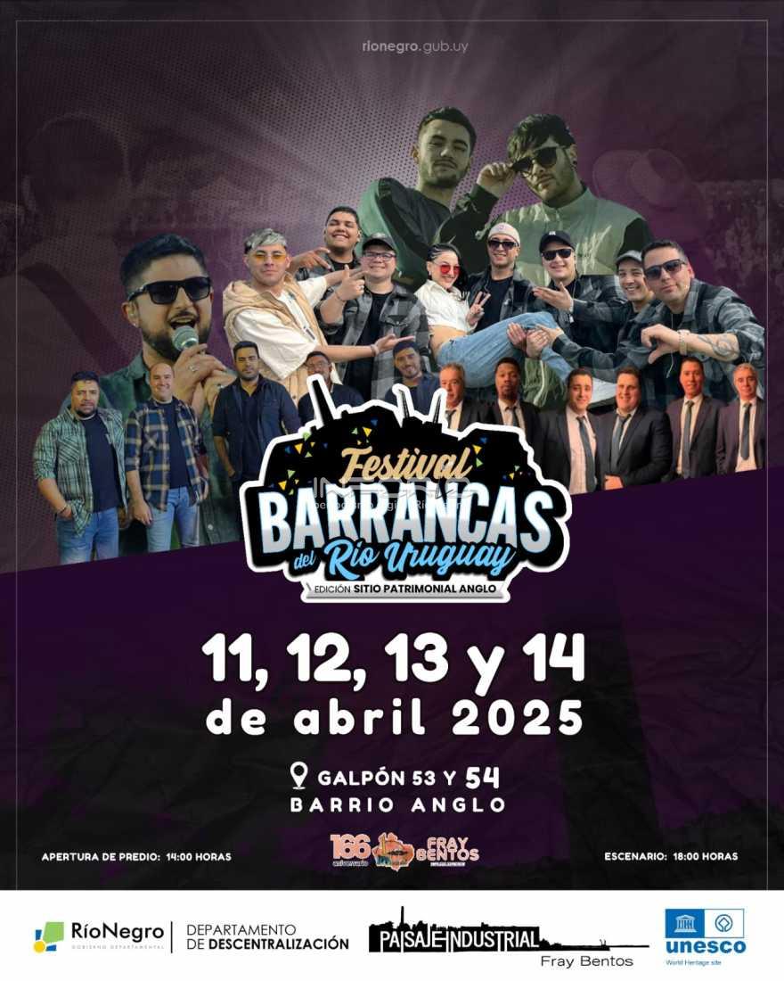Este año, el Festival “Barrancas del río Uruguay”, que se había originado en la zona de la playa La Toma, en el barrio J3 de Fray Bentos, pasa a desarrollarse en el Galpón 53 y 54 del Sitio Patrimonial del barrio Anglo.El evento comienza hoy viernes 11 de abril con variados números artíst...