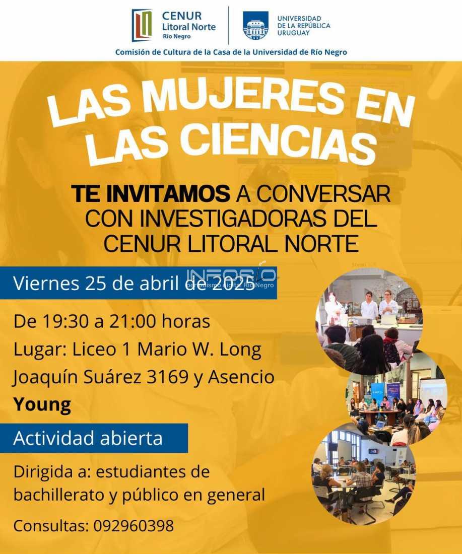 La Comisión de Cultura de la Casa de la Universidad de Río Negro, CENUR Litoral Norte, organiza una actividad denominada “Mujeres en las Ciencias”.El conversatorio se desarrollará hoy viernes 25 de abril, a la hora 19.30 en el liceo N° 1 Mario Long de la ciudad de Young.La actividad es abierta a todo ...