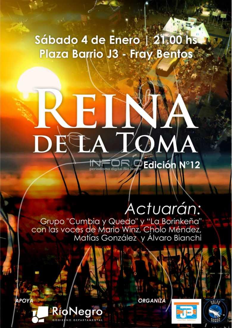 Hoy sábado 4 de enero, desde la hora 21.00, en la Plaza Barrio J3 de la ciudad de Fray Bentos, se desarrollará una nueva edición, la N° 12, de la elección de la Reina de la playa La Toma.Se anuncian espectáculos artísticos para complementar el evento tradicional del barrio J3....