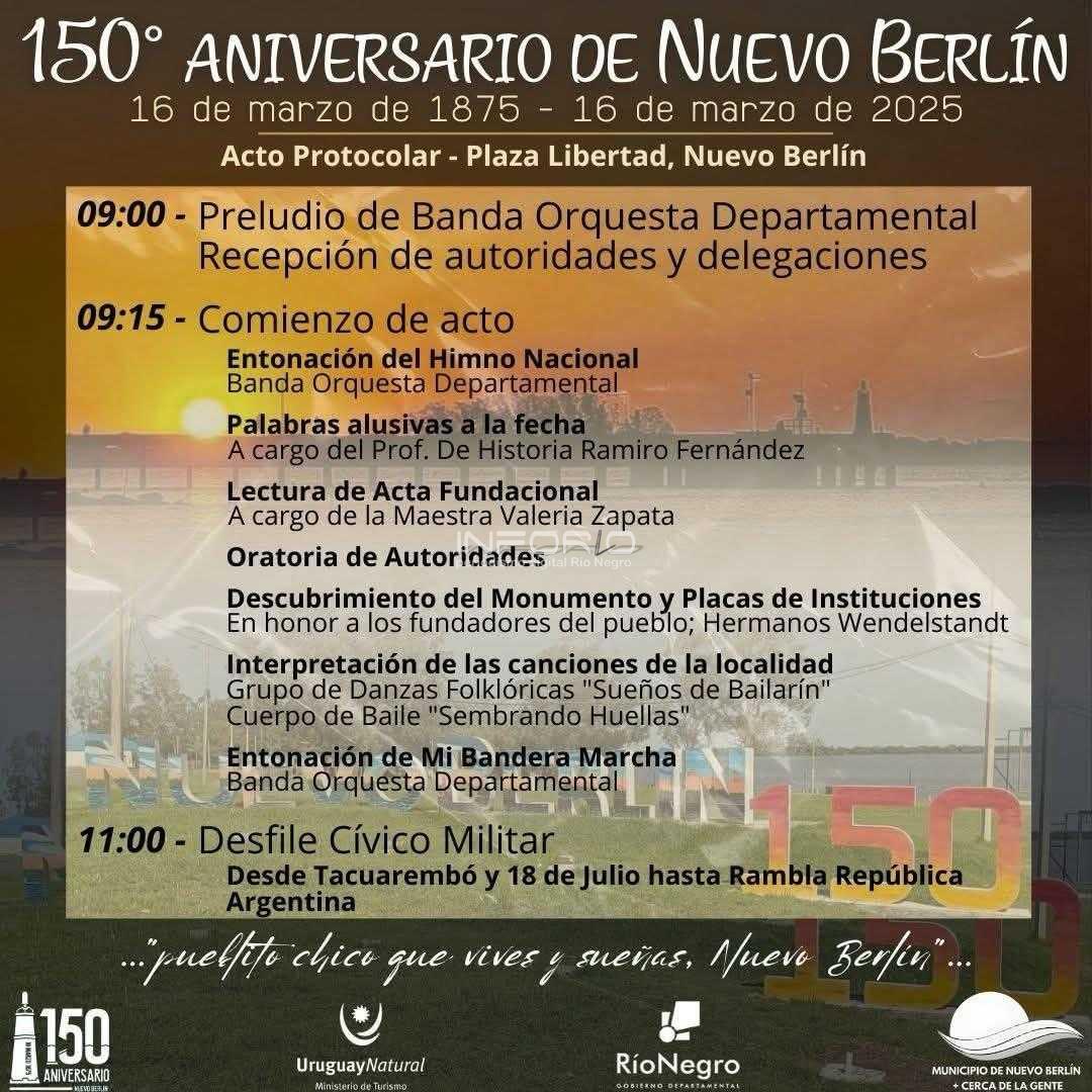 Se ha dado a conocer los detalles de la programación para el día 16 de marzo en el marco de la celebración de los 150 años de la fundación de la localidad de Nuevo Berlín.El acto protocolar será en la plaza Libertad en Nuevo Berlín, a partir de la hora 9.00, previéndose que a la ...