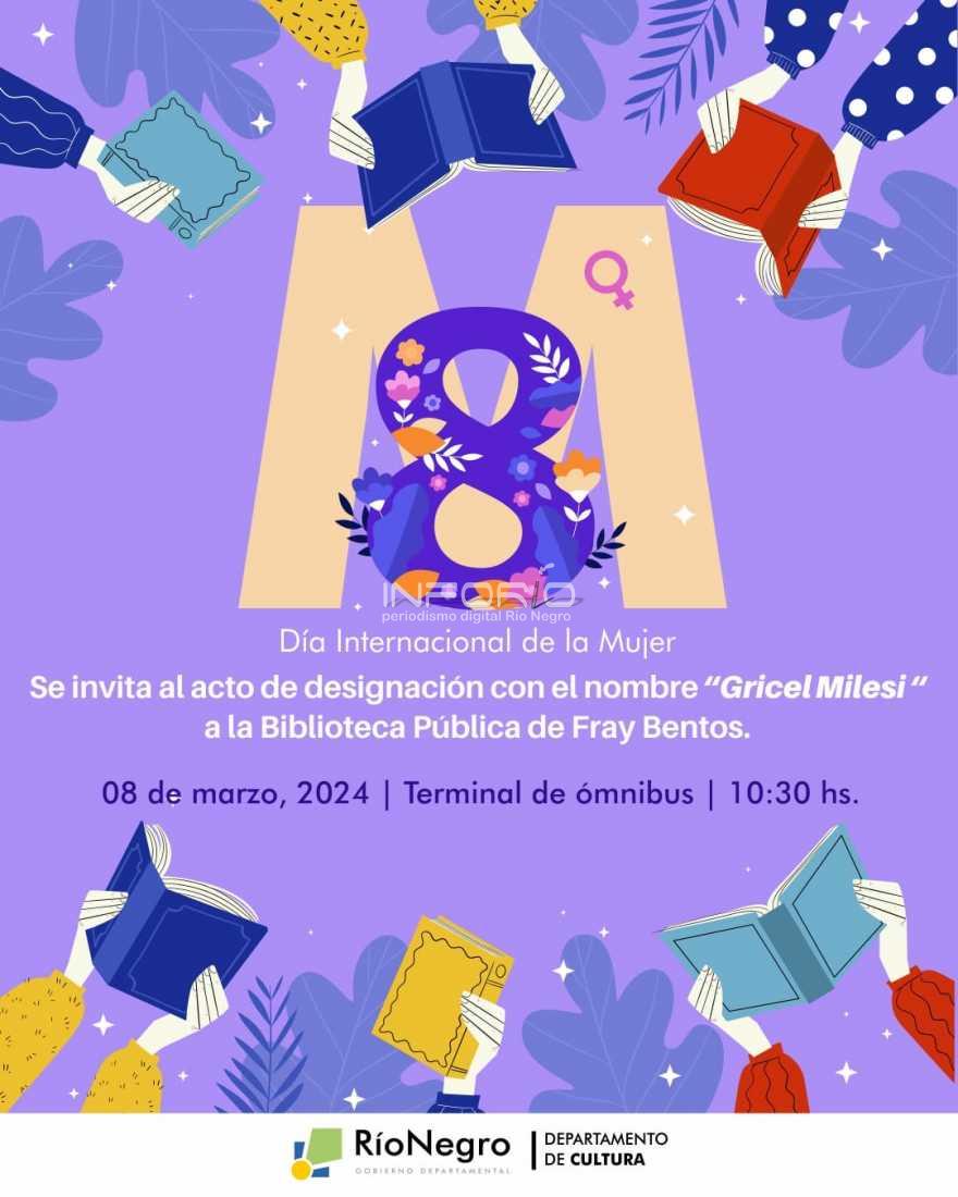 En el marco del Día Internacional de la Mujer, el Departamento de Cultura de la Intendencia de Río Negro, realizará el acto de designación con el nombre de “Gricel Milesi” a la Biblioteca Pública de Fray Bentos.La actividad se realizará el viernes 8 de marzo, a las 10.30 horas en la sede ...