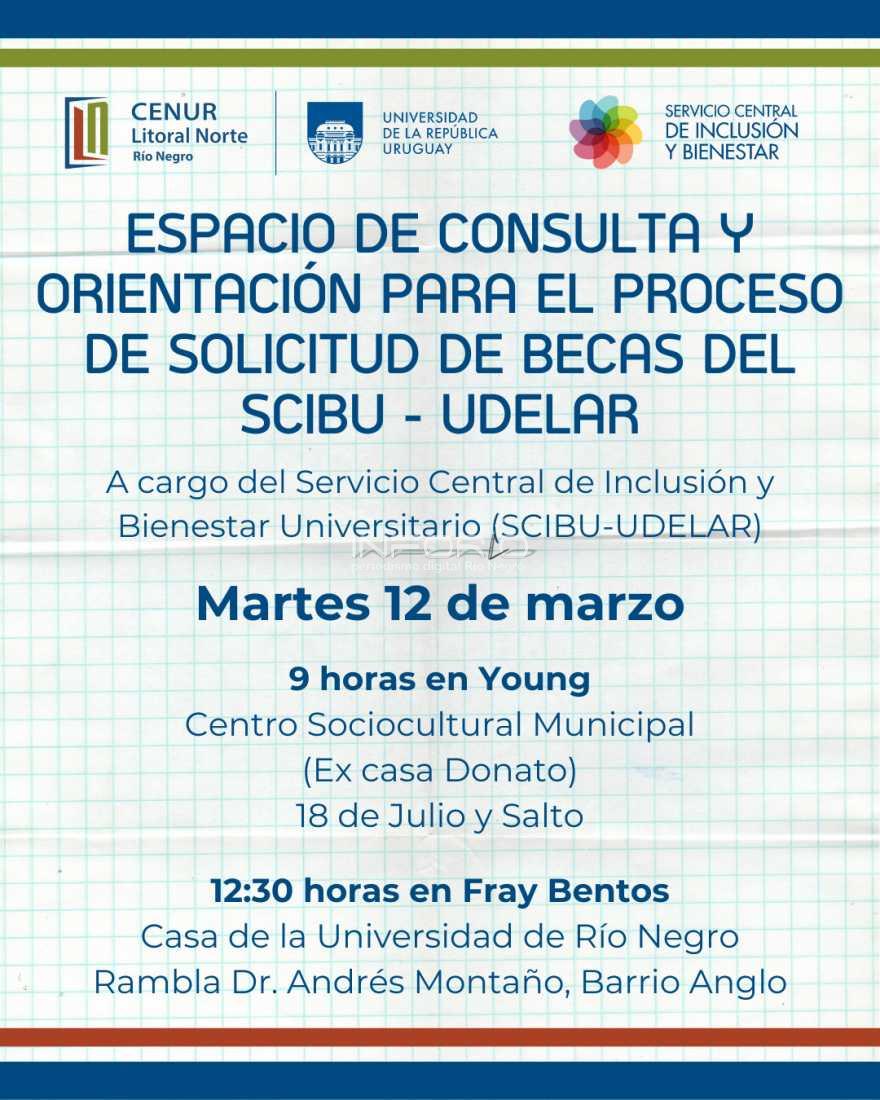 La Casa de la Universidad de la República de Río Negro invita, especialmente a estudiantes de la UDELAR, a una actividad denominada: “Espacio de consulta y orientación para el proceso de solicitud de becas del SCIBU- UDELAR”.SCIBU es el Servicio Central de Inclusión y Bienestar Universitario de la Univ...