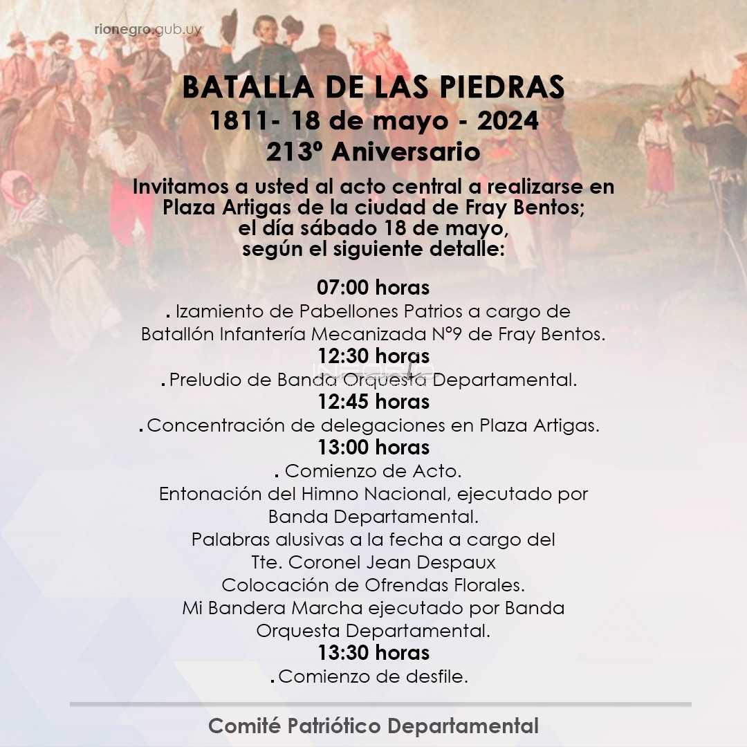 Este sábado 18 de mayo se realizará el acto de conmemoración de la Batalla de Las Piedras.El acto se desarrollará en la plaza Artigas de Fray Bentos desde la hora 13.00 para luego iniciar el desfile cívico- militar por calle 18 de Julio hasta la plaza Constitución....
