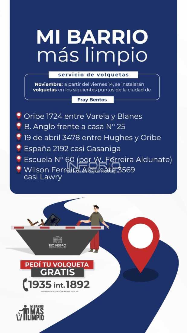 La Intendencia de Río Negro informa que, desde el 14 de noviembre, se encuentran instaladas nuevas volquetas en diferentes puntos de la ciudad de Fray Bentos.Con el objetivo de mejorar la gestión de residuos y mantener la limpieza urbana.Puntos de ubicación:* Oribe 1724, entre Varela y Blanes * Barrio An...