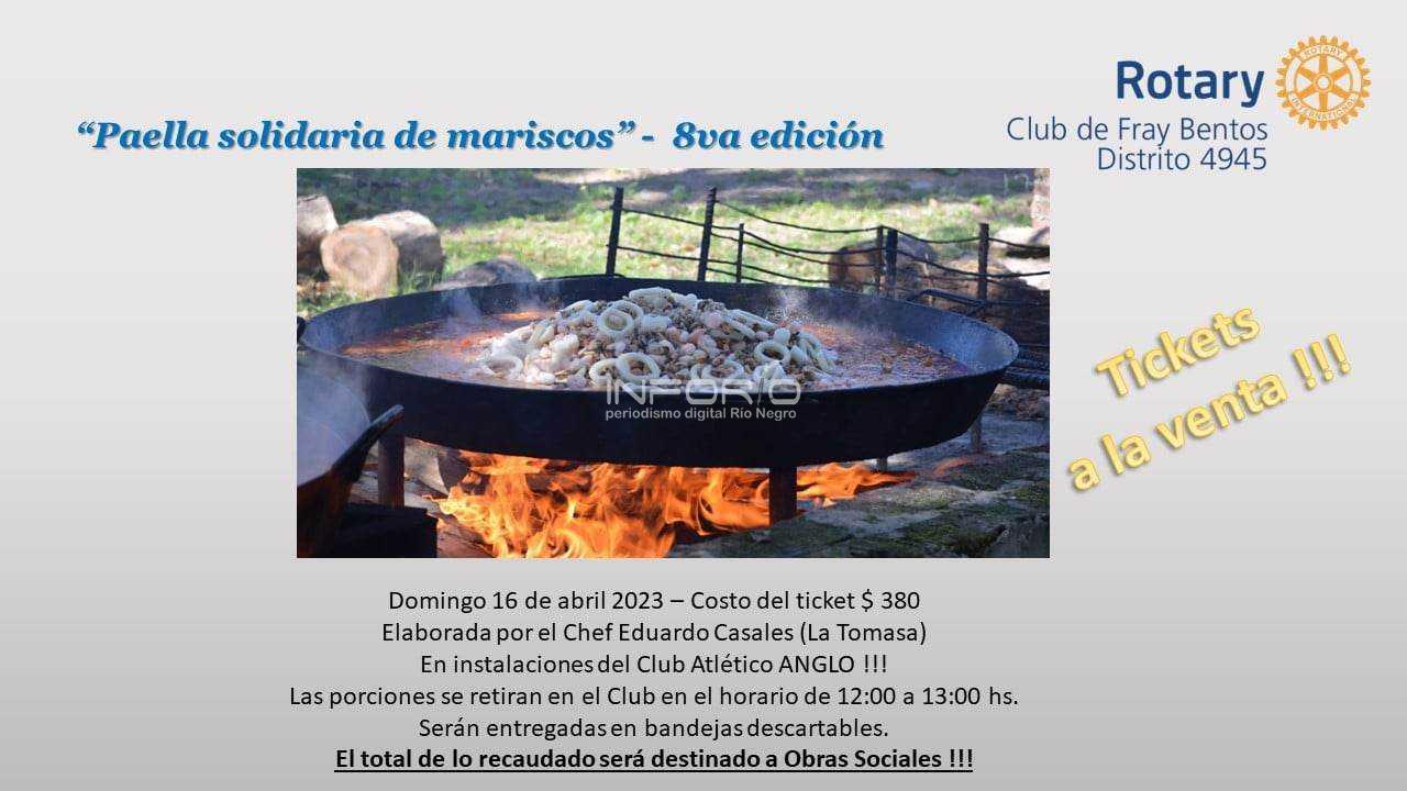 Una nueva edición de la “Paella Solidaria” de Rotary se llevará a cabo el domingo 16 de Abril, con el reconocido Chef Eduardo Casales (de “la Tomasa” en el balneario Las Cañas). Como es tradicional ya también, la Paella se realizará en instalaciones de la sede del Club Atlético An...