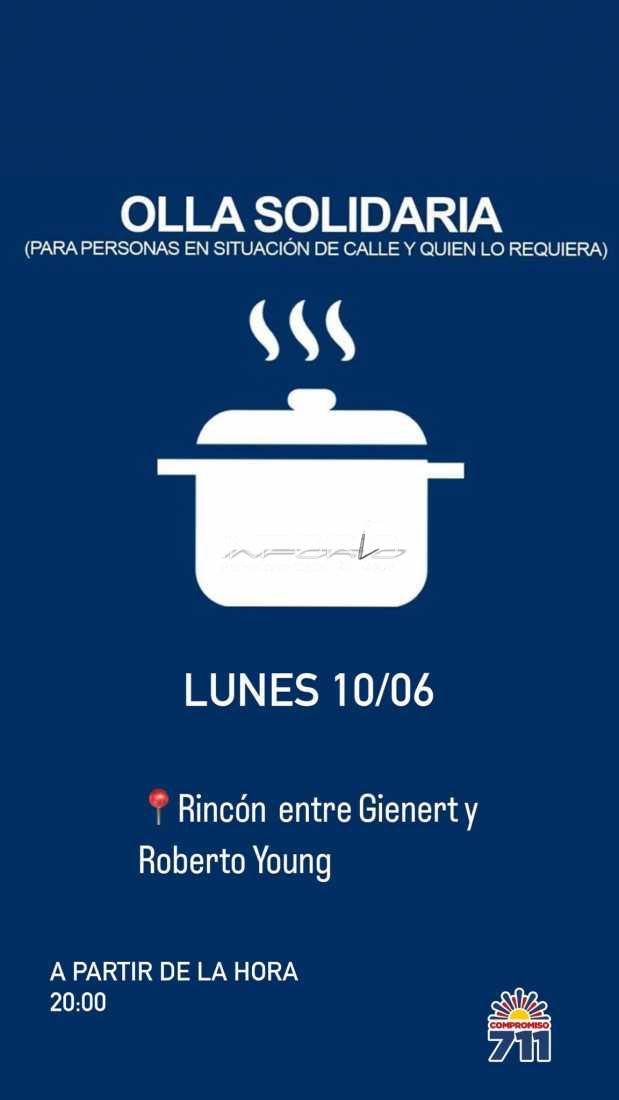 Las listas 711 y 169 están impulsando, a partir de este lunes 10 de junio, la olla solidaria para atender la clara necesidad que se percibe en la comunidad, tanto a la gente que se encuentra en situación de calle como a personas que atraviesen alguna situación particular.Jorge Ponce y José Olivera, integrantes de ...