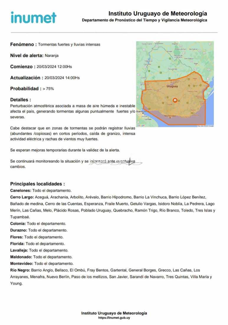 El Instituto Uruguayo de Meteorología emitió comunicado de Alerta Meteorológica, donde está incuido nuestro departamento. Ver foto que ilustra el anuncio.-...